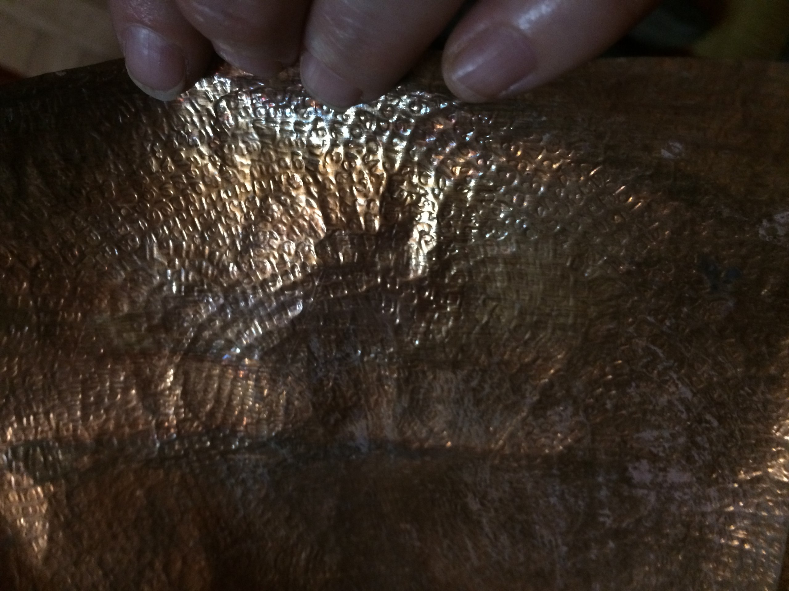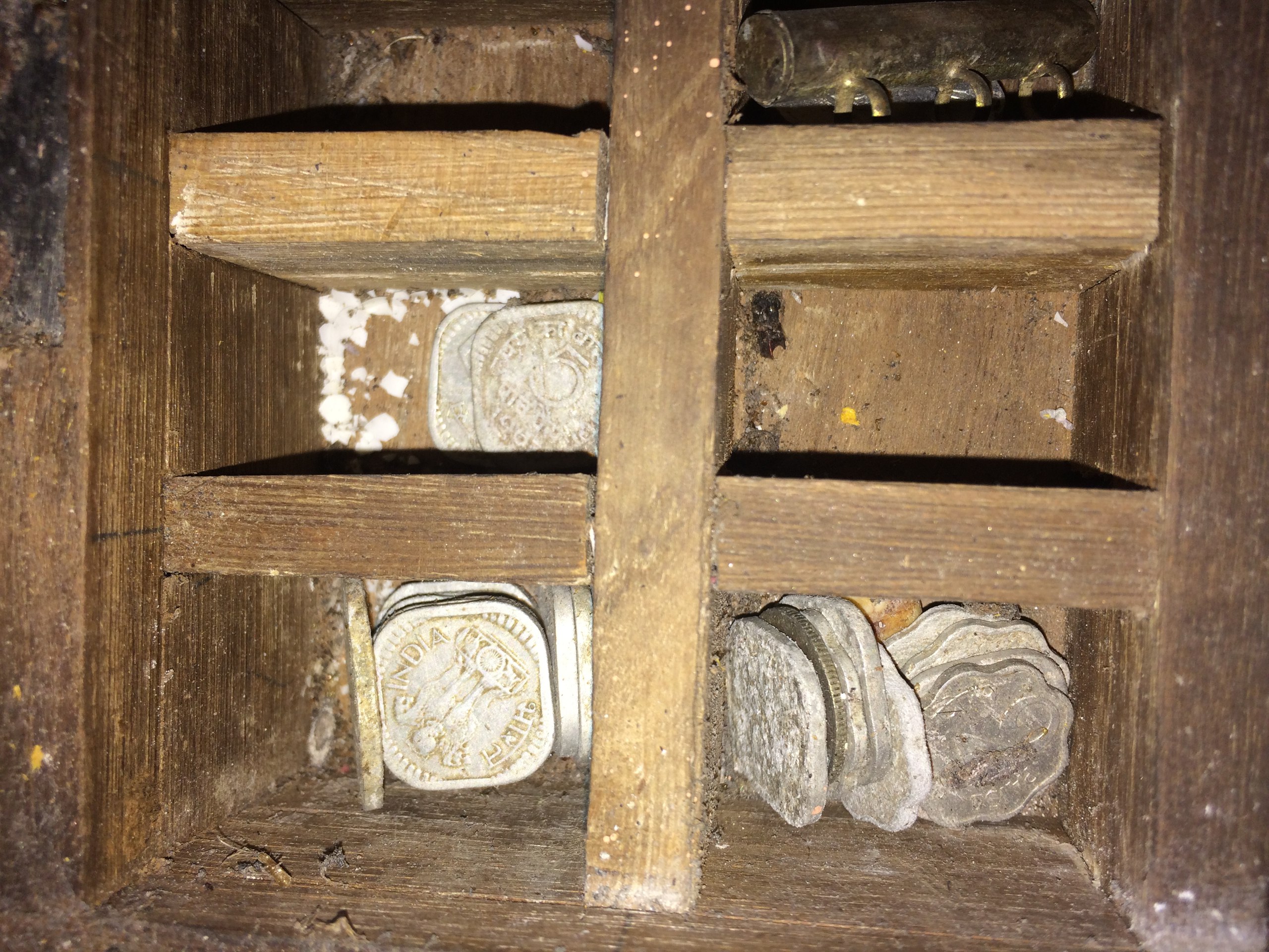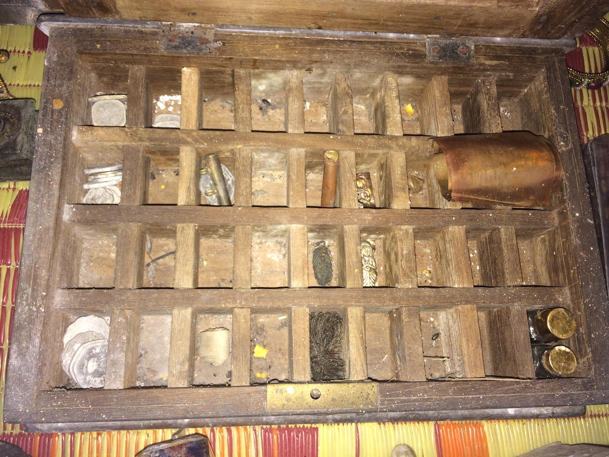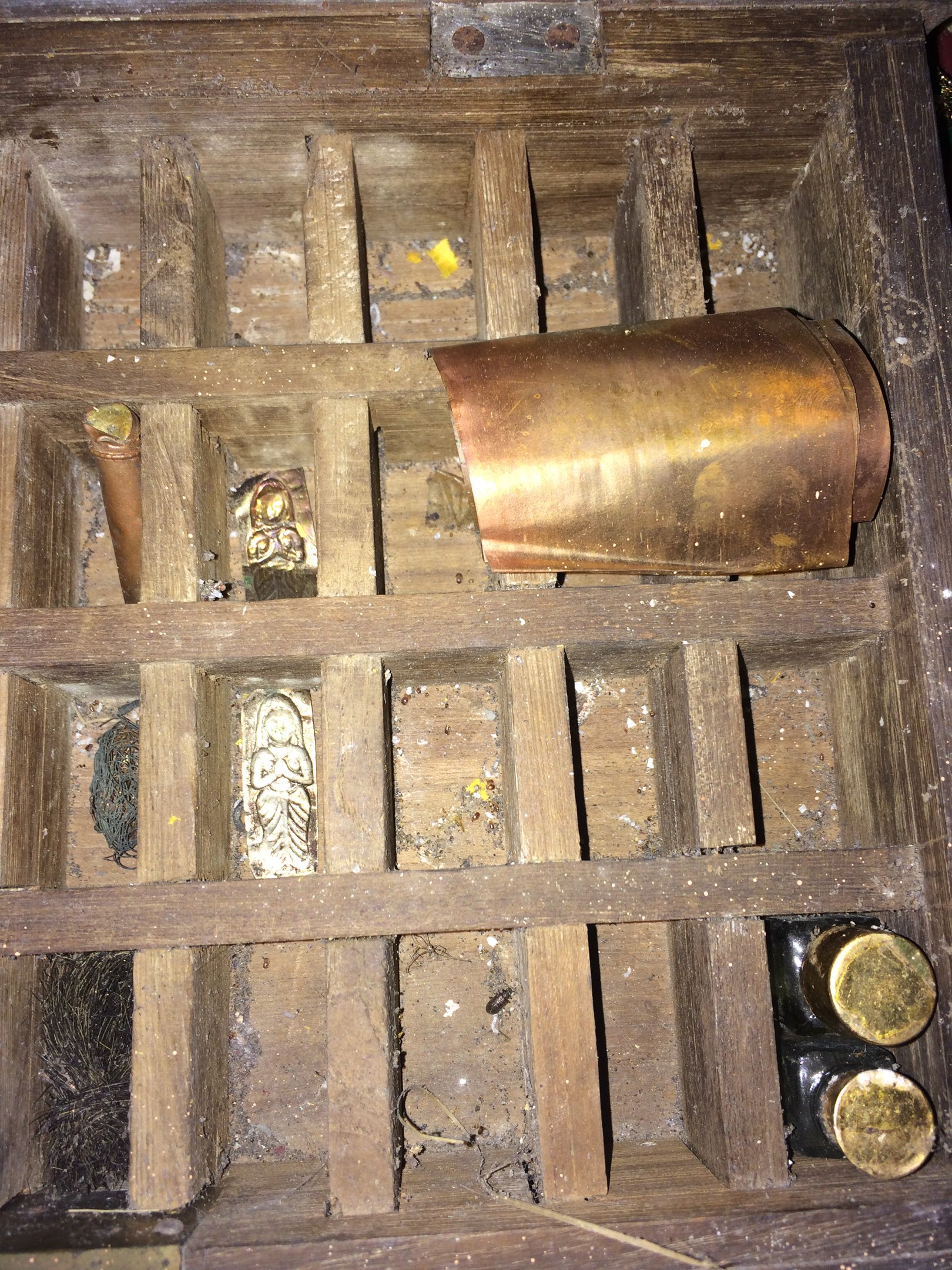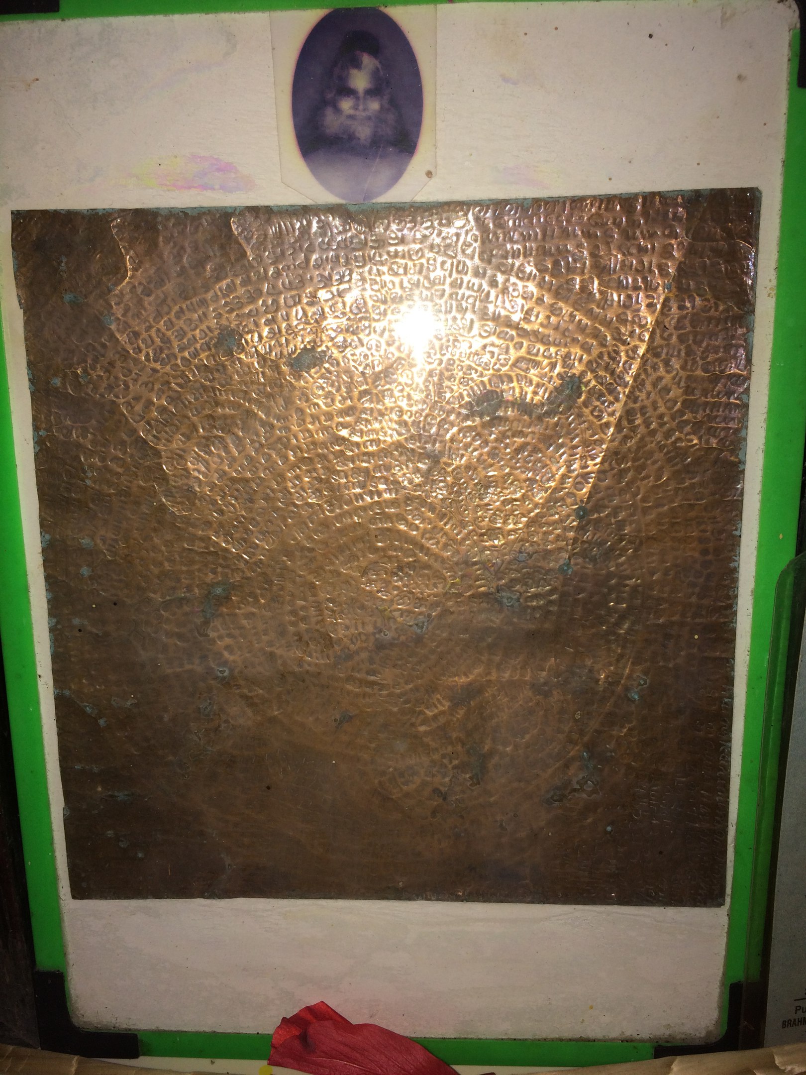Каждый день приходя в дом, где находится комната Брахмананды и Его реликвии, мы медитируем. Сегодня Шанти нам показала содержимое шкатулки – там находились монетки, кавачи, кусочек металлической пластины, на которой Шива Прабхакара делал свои записи в виде иероглифов. Вот эти фото