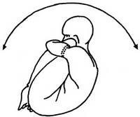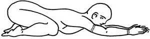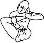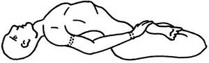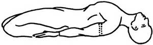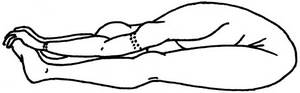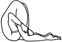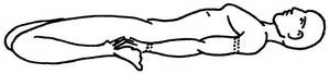 Lying on your back, put your feet behind the head, with the knees covering the ears.