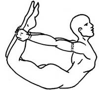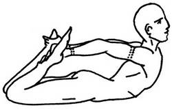 On finishing the asana, put your feet behind your head and slowly (vertebra by vertebra) lower your back and feet to the floor.