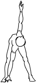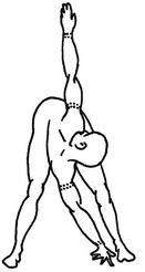 Spread your arms apart and, turning to the right, place your left hand on the outside of your right foot.