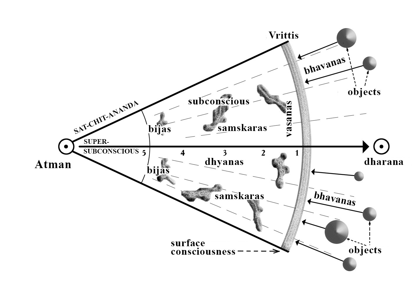 In fact, why do we suffer? Why do we not realize our Higher Self? If we imagine our consciousness as some sphere, our true self-awareness (Atman) is its center. The beam of its attention is directed to the periphery. This ray moves on the plane of the superficial consciousness. It slightly goes through the superficial consciousness to objects and enters the subconscious slightly. It is our existence in the World of Phenomena. Here is our meditation and self-liberation. The ray of our consciousness illuminates only this narrow range. Superficial consciousness is our thoughts. Thoughts move from birth to death in an unceasing flow.