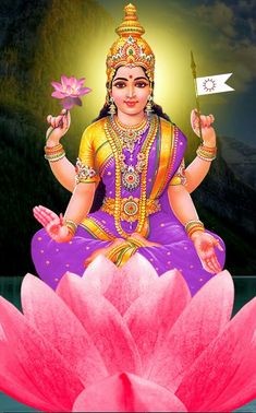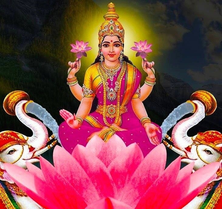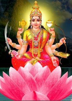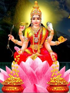 Дхана Лакшми – богиня, дарующая богатство. Она изображается в красных одеждах, с шестью руками, в которых держит чакру, шанкху (морскую раковину), кувшин с амритой, лук со стрелой, лотос, показывает абхайя мудру с падающими из нее золотыми монетами.