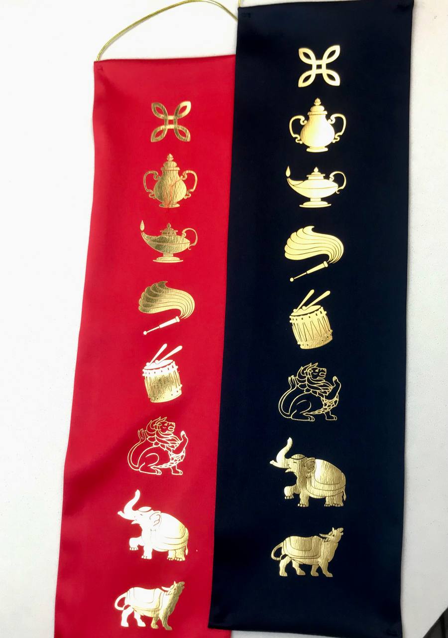 Через внешнее служение божественному, человек набирается энергии, символ энергии - слон как принцип шакти. Лев символизирует способность взять мысли, желания и чувства под контроль, подобно строгому и мудрому царю, держащему подданных в дисциплине. Эти три животных являются символами очищения нашей животной природы для трансформации ее в божественную. Эти этапы - работа с энергией, контроль пран, очищение каналов, открытие уровней радости, благости. Следующий символ - барабан - этап пробуждения, этап, в котором садху утончается и начинает слышать божественные звуки нада. Опахало символизируют вхождение в дхьяны, погружение в еще более тонкие состояния. Светильник означает возжигание внутреннего огня самоосознания, света тонкого интуитивного разума будхи, а также вхождение в Ясный Свет, осознание, что природа всех явлений - Свет. Камандал символизирует принцип пустого сосуда: садху осознает себя, как инструмент Бога, божественная реальность свободно проявляется через его тело, речь и ум. Заключительный благоприятный знак - божественное оружие ваджра - символ абсолютной симметричности, равностности и искоренения неведения, принцип осознанности.