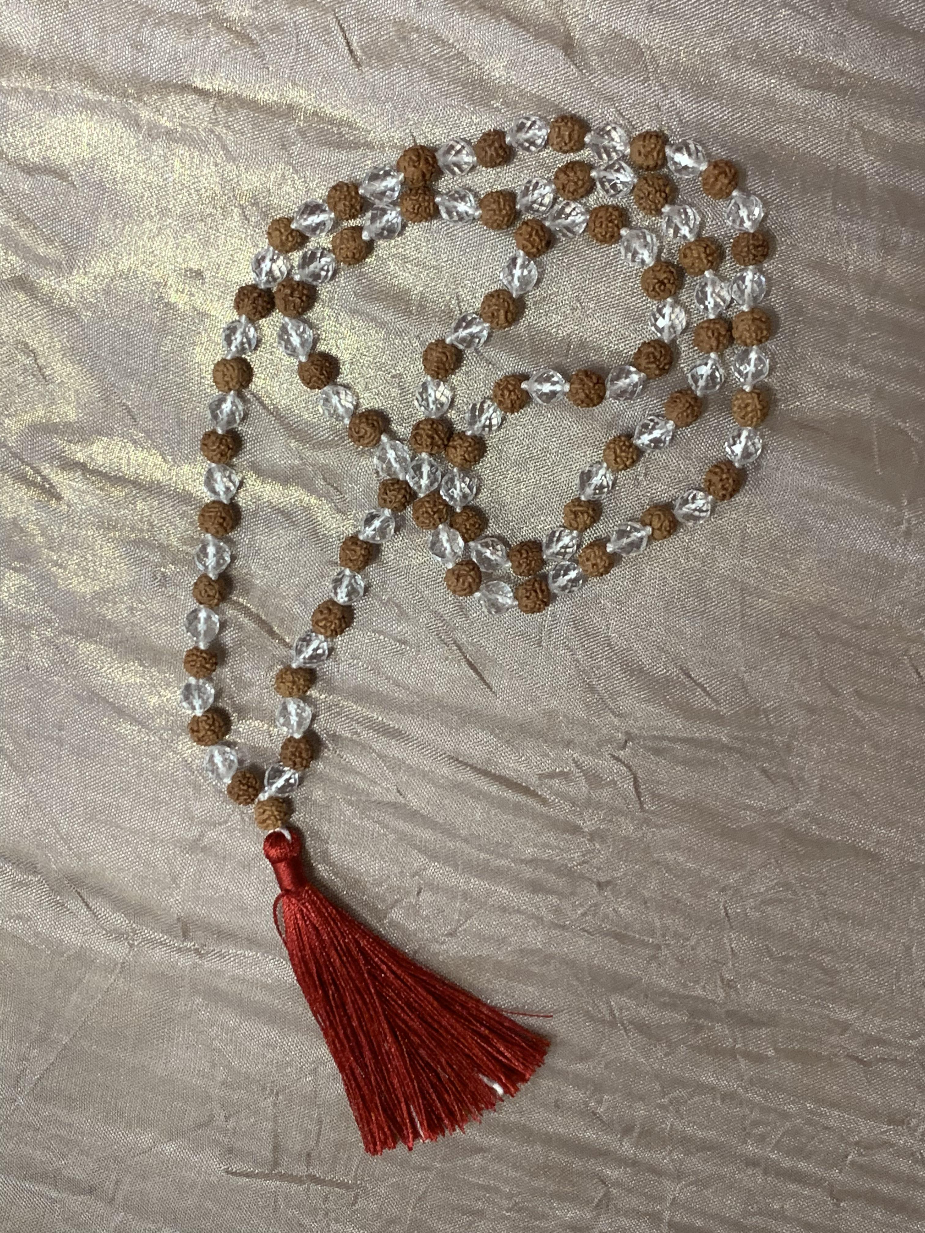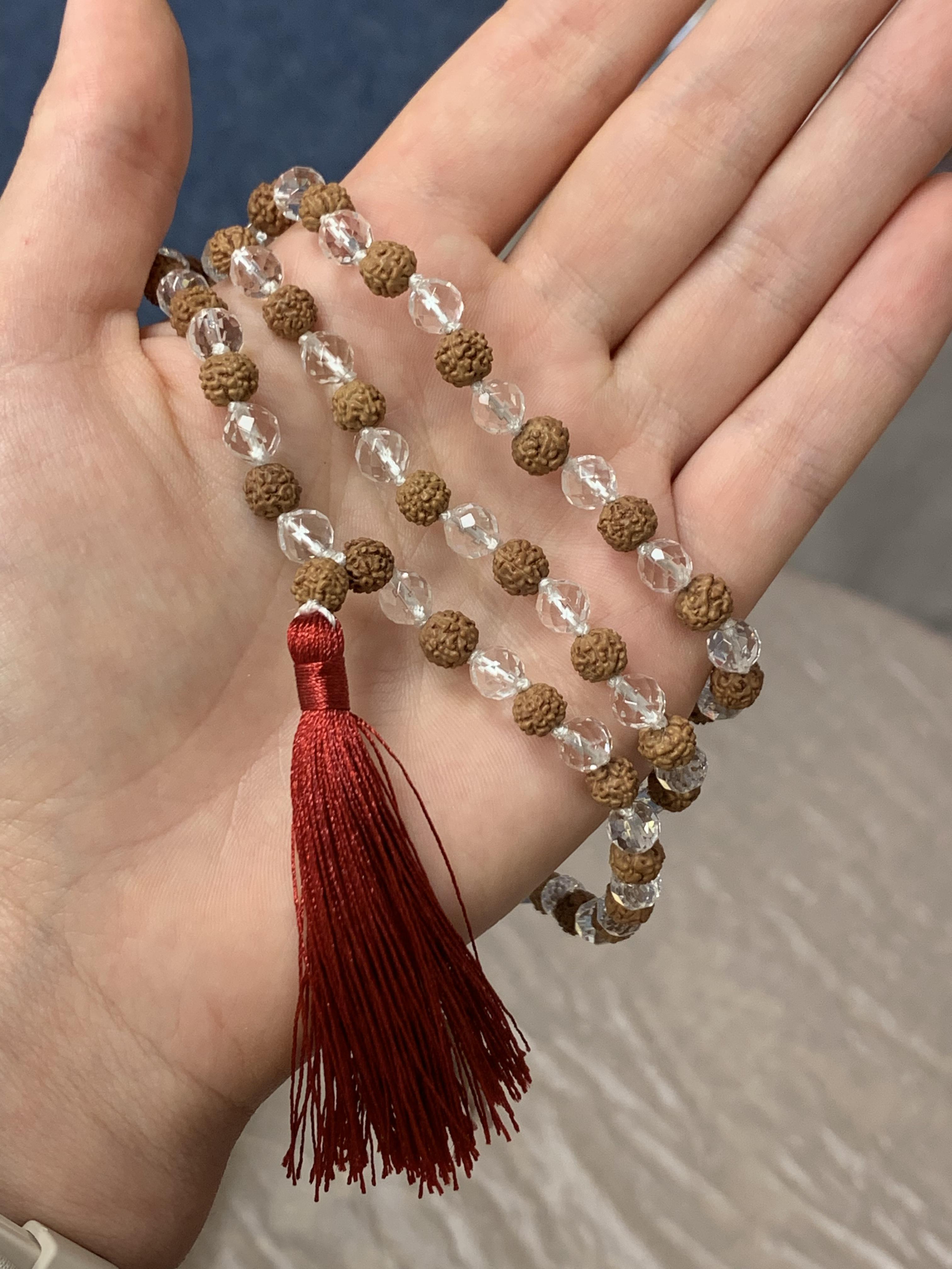 Четки 108 бусин. Рудракша и горный хрусталь 6 мм