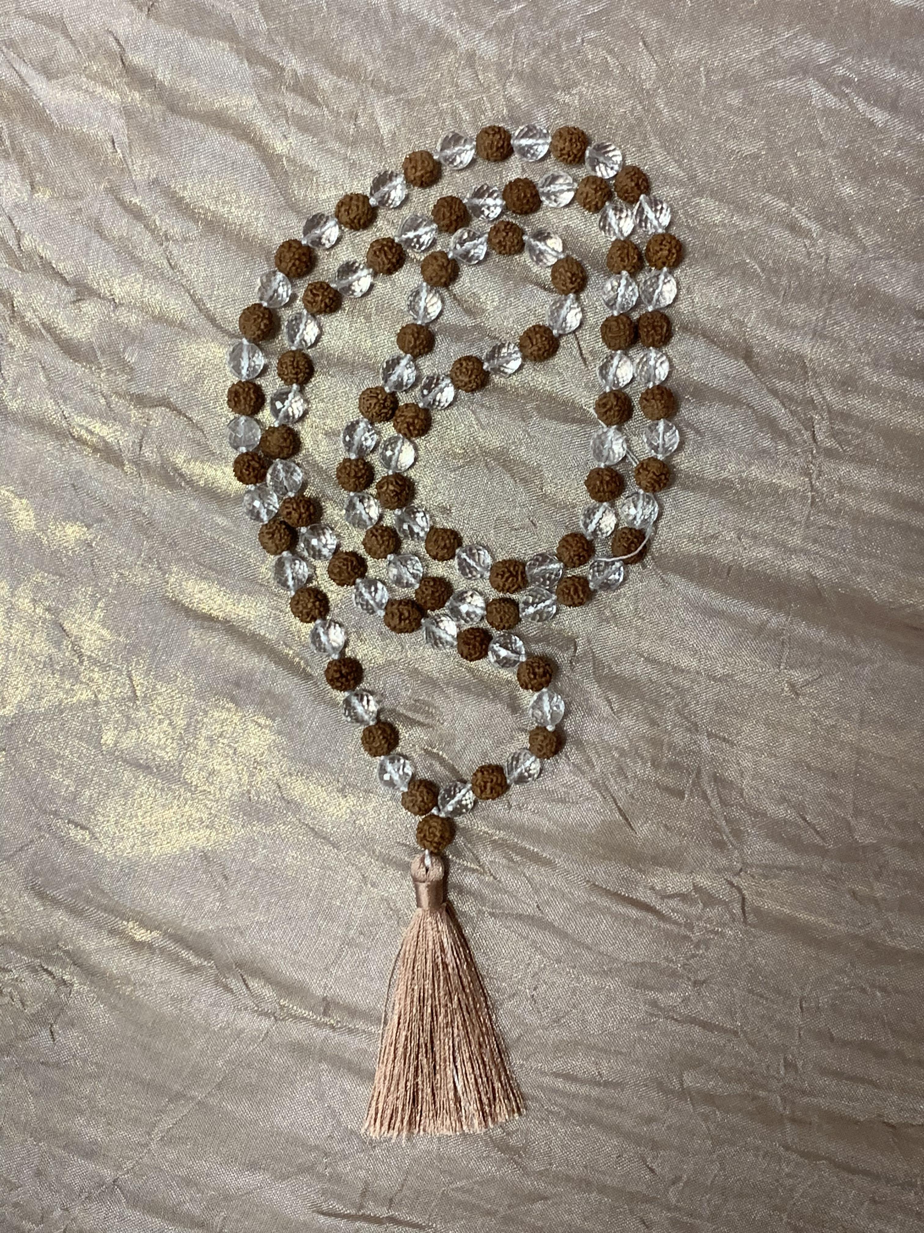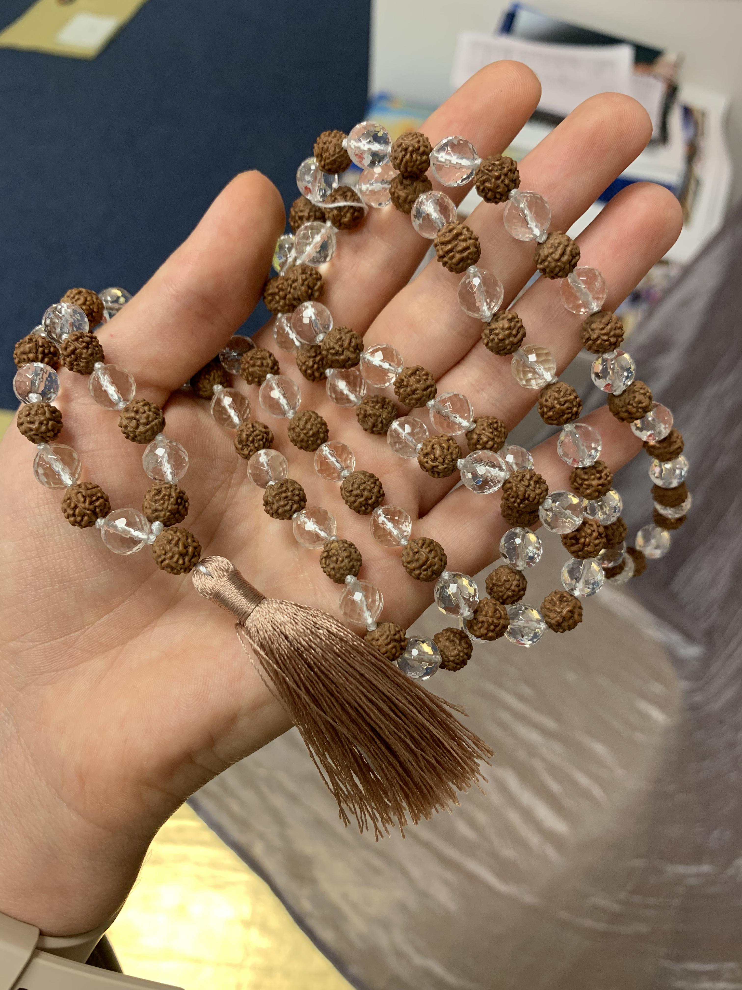 Четки 108 бусин. Рудракша и горный хрусталь 8 мм